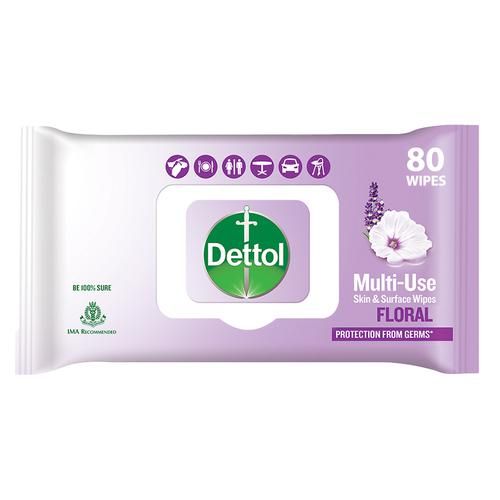 Dettol Disinfectant Sanitizer Wet Wipes - Multi-purpose, For Skin & Surfaces, Floral, 80 pcs