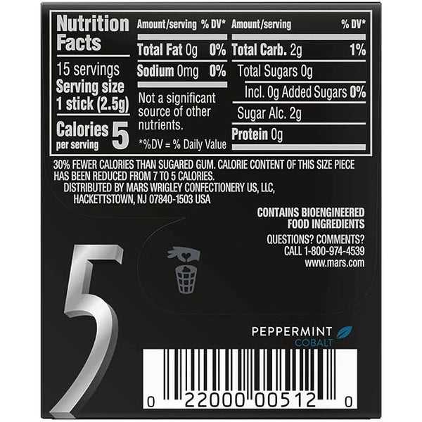 5 Cobalt Peppermint, Sugar Free Gum, 15 Sticks, 40.5 g