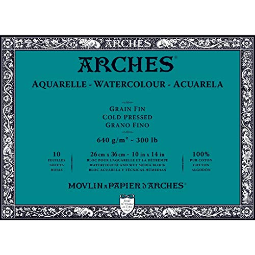 Arches Watercolour- Aquarelle - 26 cm x 36 cm Natural White Fine Grain/Cold Press 640 GSM Paper, 4 Side Glued Pad of 10 Sheets