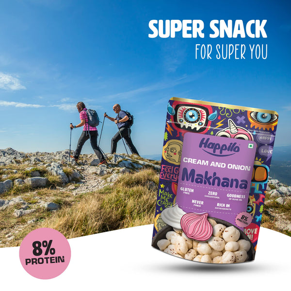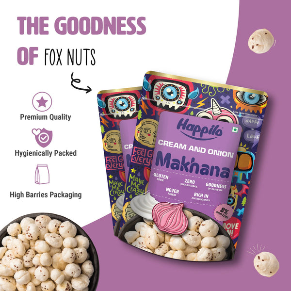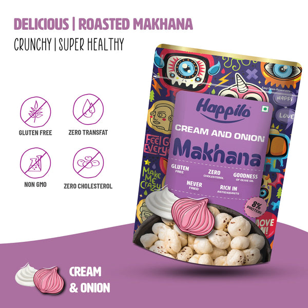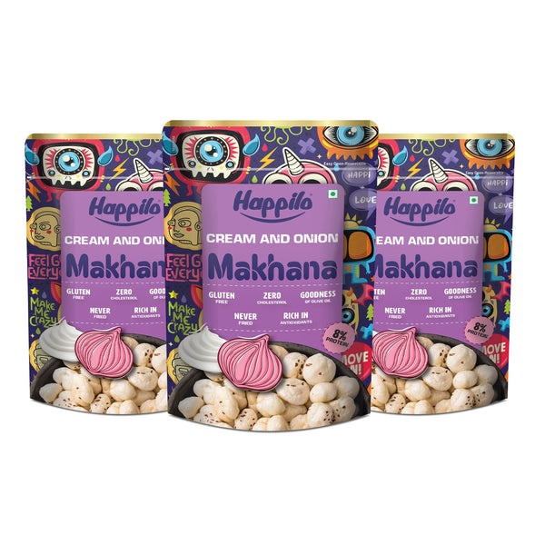 Happilo Premium Super Snack Makhana Cream & Onion 60g (Pack Of 3), Roasted Foxnut Healthy Snack Low Calorie Gluten Free and Vegan