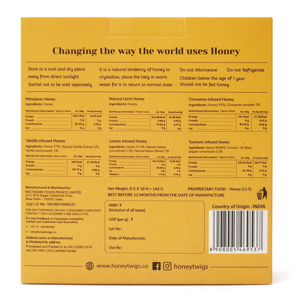 Honey Twigs Tasterz Honey Combo Pack Himalayan Multiflora, Natural Litchi, Cinnamon, Vanilla, Lemon and Turmeric Infused Honey : 3 Sachets x 6 flavors | 100% Natural & Traceable Source No Added Sugar