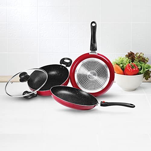 Milton Pro Cook Kitchen Jewel Set of 3 (Fry pan 24 cm/1.6 litres; Kadhai 24 cm/2.5 litres with Glass lid & Tawa 25 cm), Maroon | Induction Safe | Dishwasher Safe | Hot Plate | Flame Safe | Non-Stick