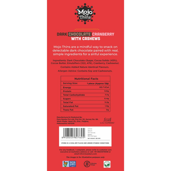 Mojo Bar Thins - 45% Dark Chocolate Cranberry with Cashews (Vegan, Portion Controlled), 108 GM