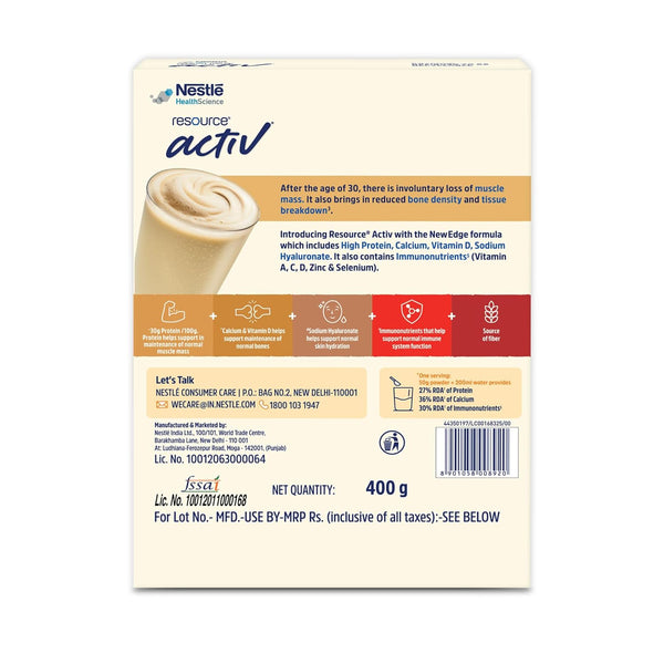 Nestlé Resource Activ, High Protein Shake with New Edge Formula, Vanilla Flavour, Strengthens Muscles, Bones, Immune System, Improves Skin 400g Bag-in-box pack