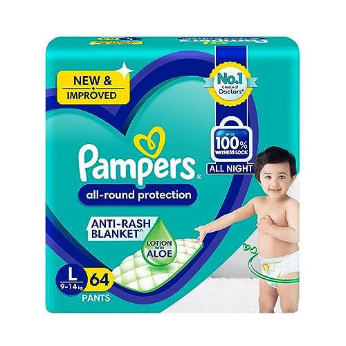 Pampers All round Protection Pants Style Baby Diapers, Large (L) Size, 64 Count, Anti Rash Blanket, Lotion with Aloe Vera, 9-14kg Diapers