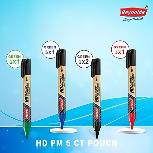 Reynolds HD permanent marker - 2 Black, 1 Blue, 1 Red & 1 Green, Pack of 5
