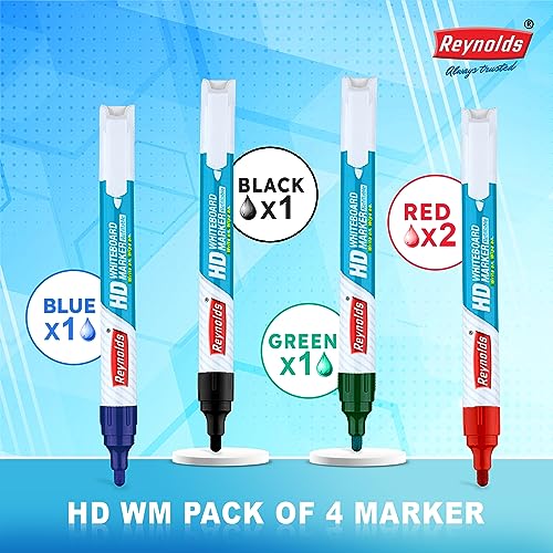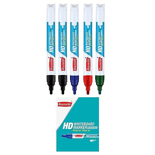 Reynolds HD Whiteboard marker - 2 Black, 1 Blue, 1 Red & 1 Green, Pack of 5