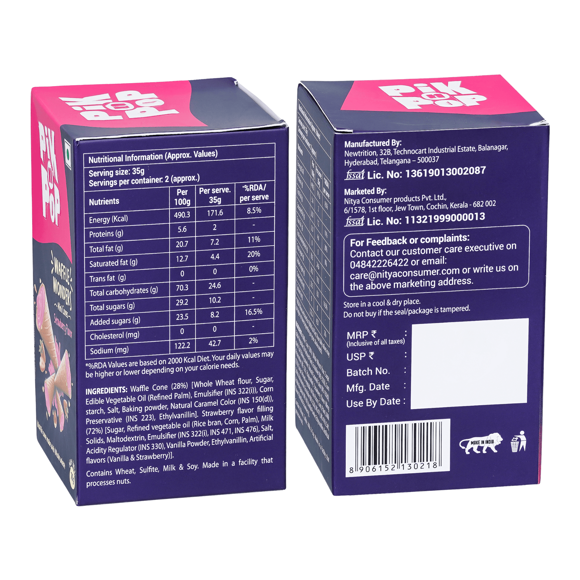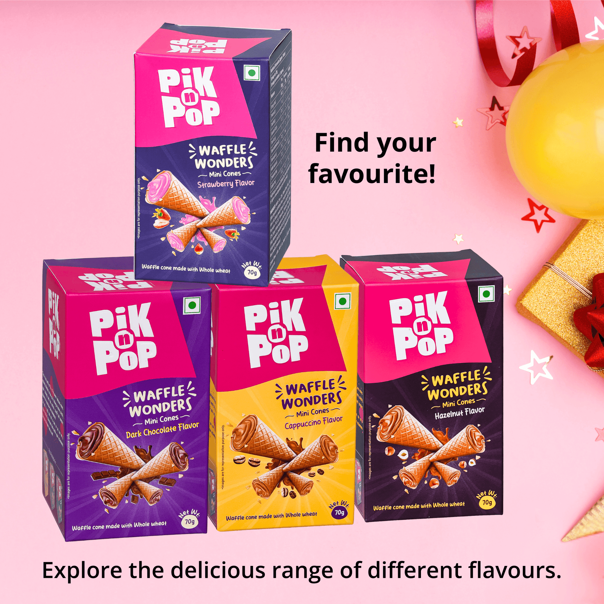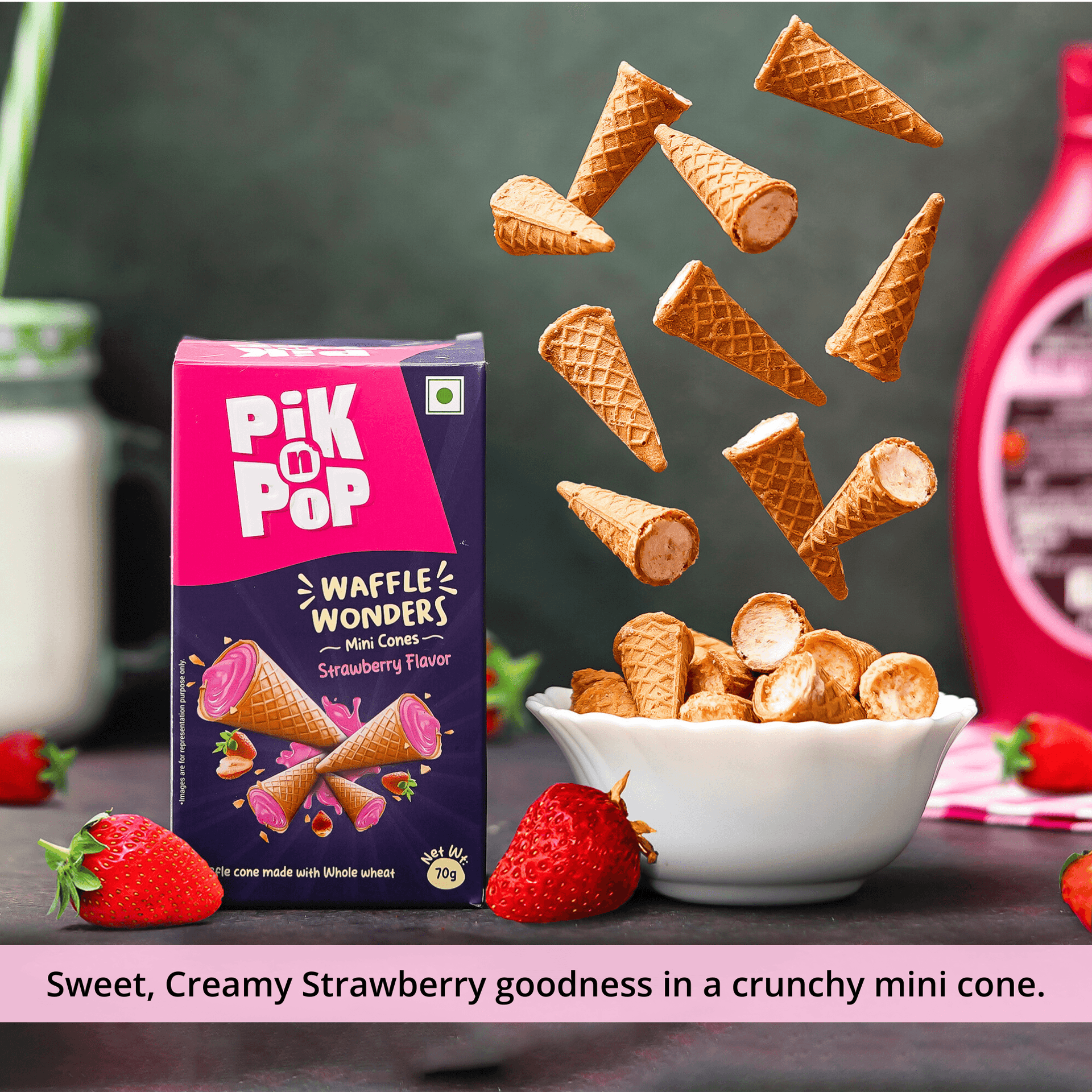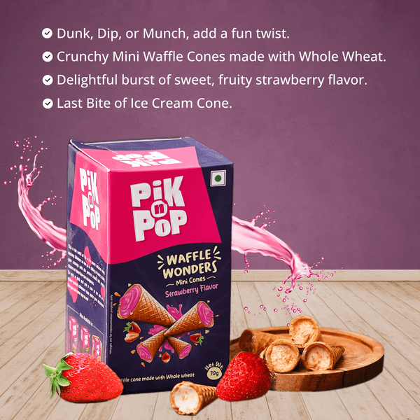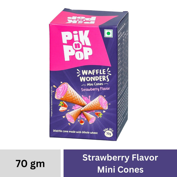 Pik n Pop Strawberry Flavour Mini Waffle Cones | 70g | Whole Wheat | Eggless