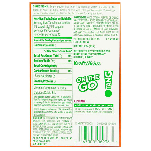 Tang On The Go Orange Sugar Free Drink Mix 6 Individual Sachet Box,(3.6g X 6) 22g