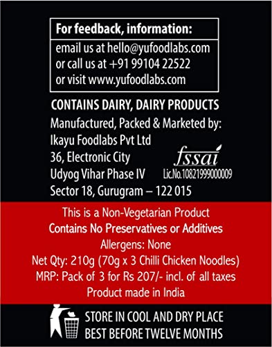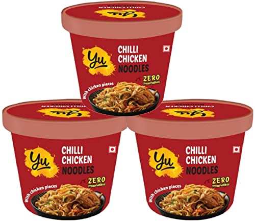 Yu Foodlabs Cup Noodles - Chilli Chicken Spicy Non Veg Ramen Noodles - Pack of 3 - No Preservatives - Instant Food - 100% Natural - Ready to Eat Saucy Instant Noodles - 675 grams