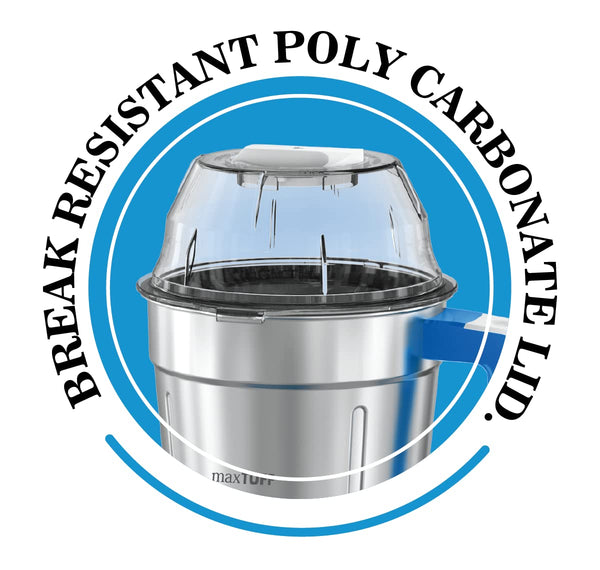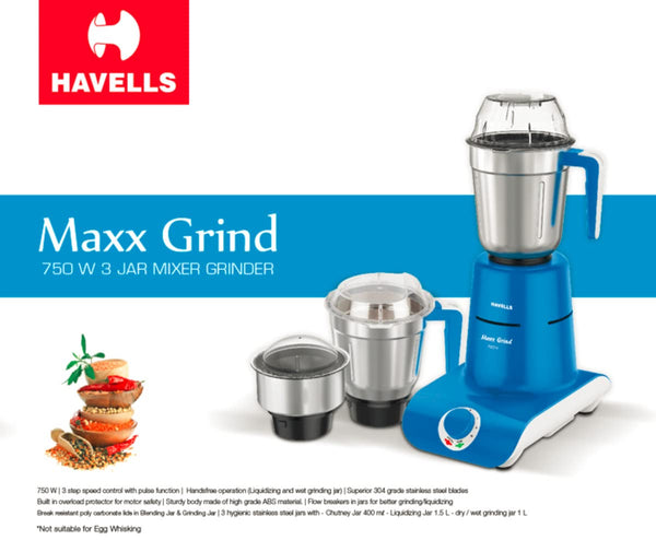 Havells Maxx Grind 750 watt Mixer Grinder with 3 Wider Mouth Stainless Steel Jar, Hands Free Operation, SS-304 Grade Blade, Overload Indicator & 5 Year Motor Warranty (Blue).