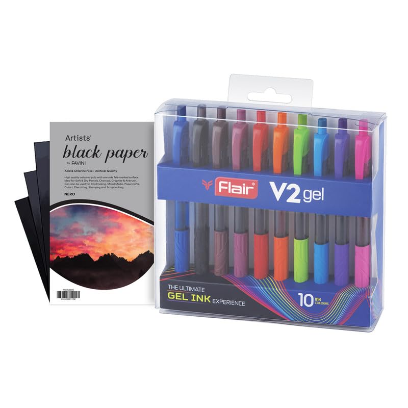 Flair V2 0.7mm Gel Pen With 6x6 Colorissimi Paper Combo Pack,Nero,Black