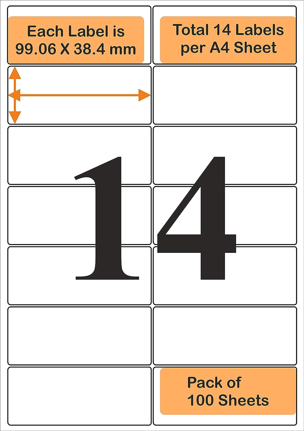 Oddy A4 Paper Label Stickers for Laser & Inkjet Printers | 14 Labels per Sheet - Pack of 100 Sheets | for Shipping, Address, Folders, Industrial use