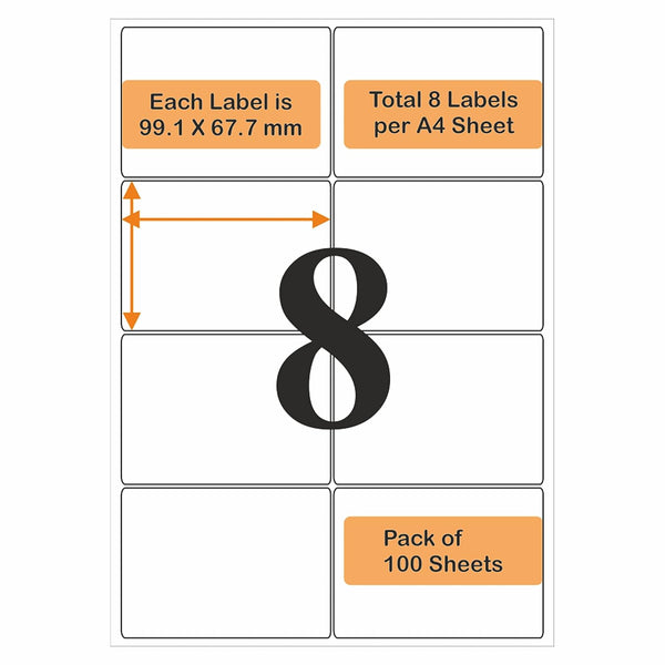 Oddy A4 Self Adhesive Paper Label Stickers for Laser & Inkjet Printers - 8 Labels per Sheet - Pack of 100 Sheets, for Shipping, Address, Folders, Industrial use