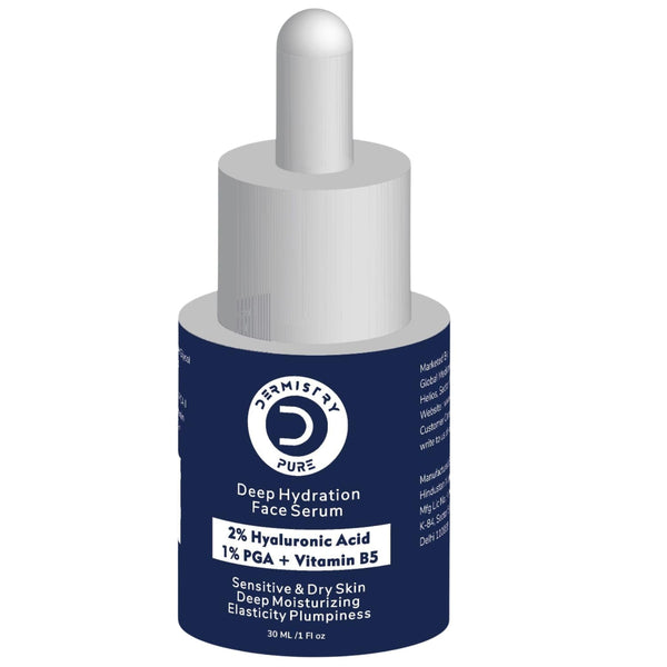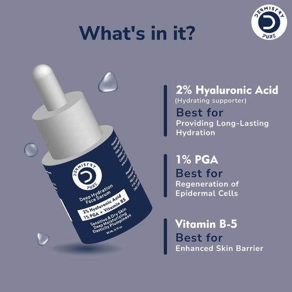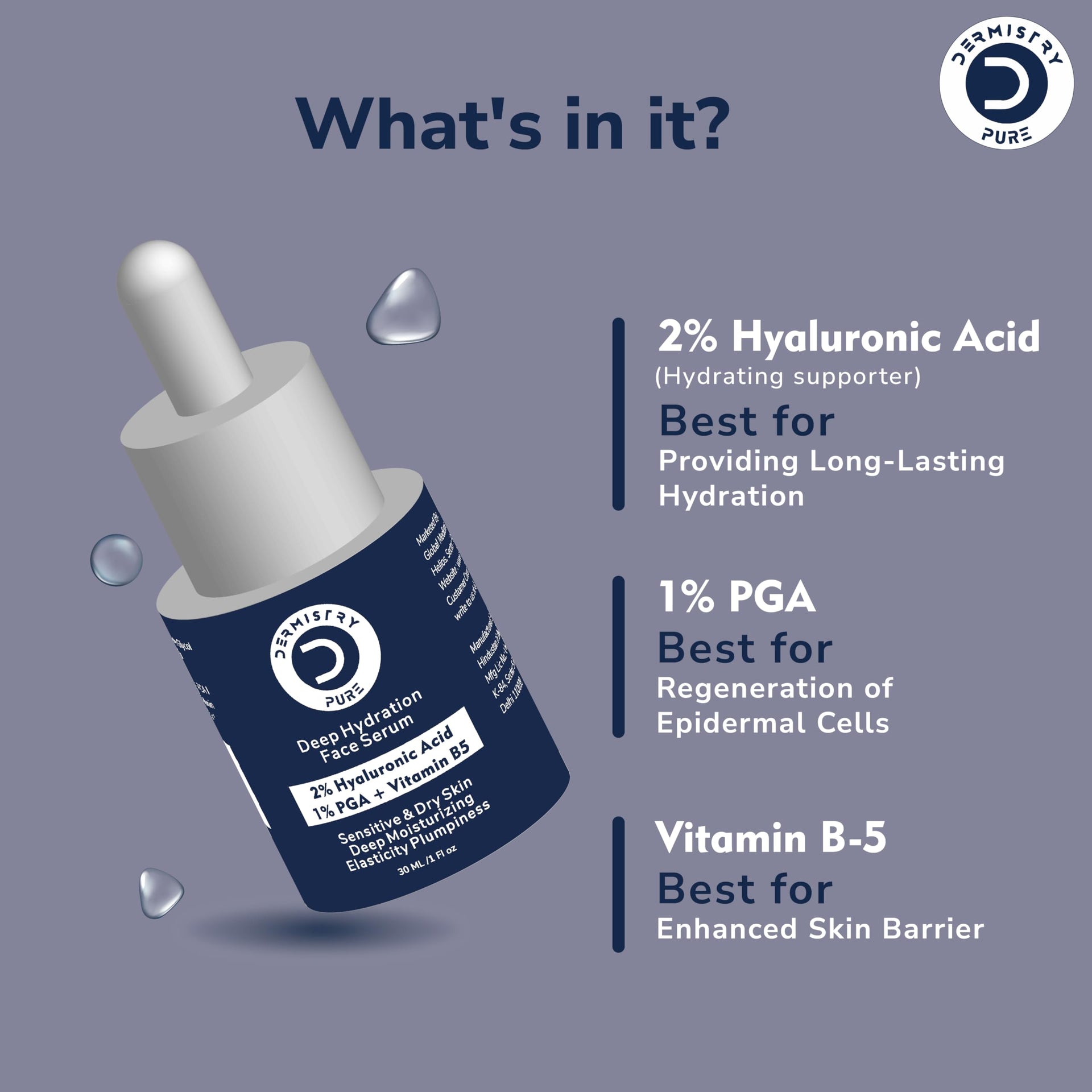 Dermistry Pure 2% Hyaluronic Acid 1% PGA Vitamin B5 Face Serum for Sensitive & Dry Skin Intense Hydrating Moisturiser for Day Night Deep Moisturizing Elasticity Plumpiness Soft Supple Skin 30ml