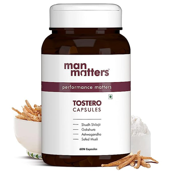 Man Matters Testosterone Supplement | 60 Capsules | Shilajit, Ashwagandha, Gokshura & Safed Musli | Improve Performance, Muscle Strength, Energy, Stamina & Overall Health