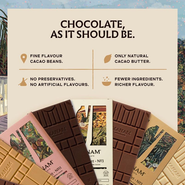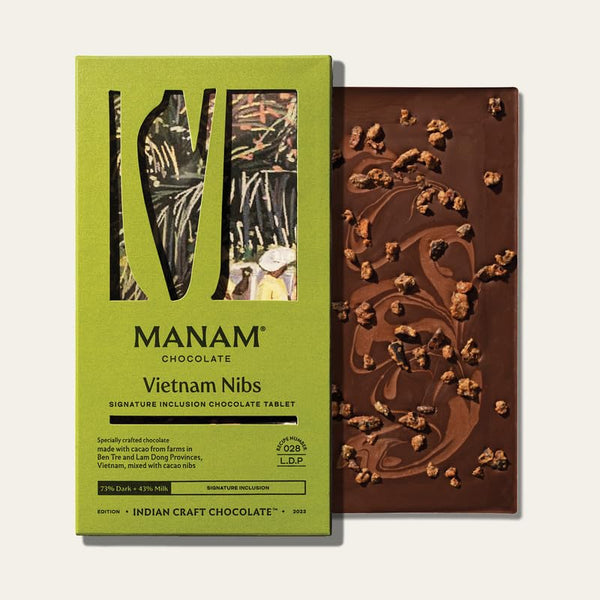 Manam Chocolate Signature Inclusion Tablet - Vietnam Nibs, 73% Dark & 43% Milk - 80g