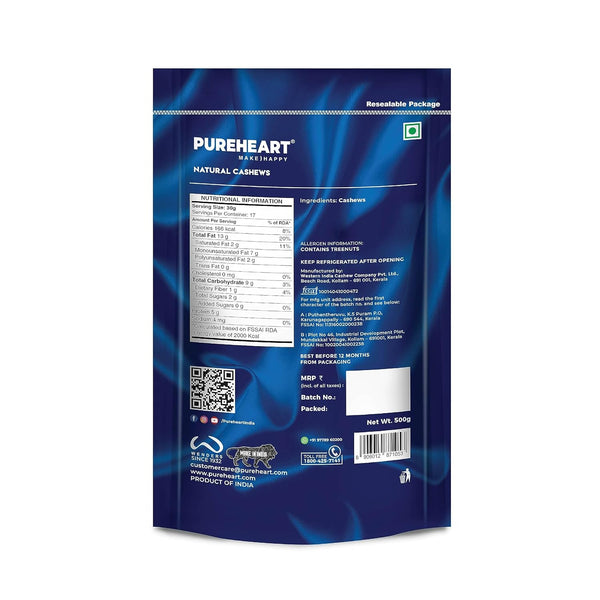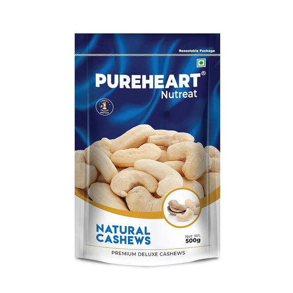 Pureheart Nutreat Natural Cashews (500 gm) Premium Whole Crunchy & Delicious Cashewnuts/Kaju/Dry Fruit - Resealable Pouch