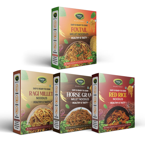 Thanjai Natural Millet Noodles 180 Grams X 4 Varities (720 Grams) of Homemade Natural Foxtail | Horsegram | Ragi and Red Rice Millets Noodles(Preservative Free, No Chemicals, No Artificial Extract)